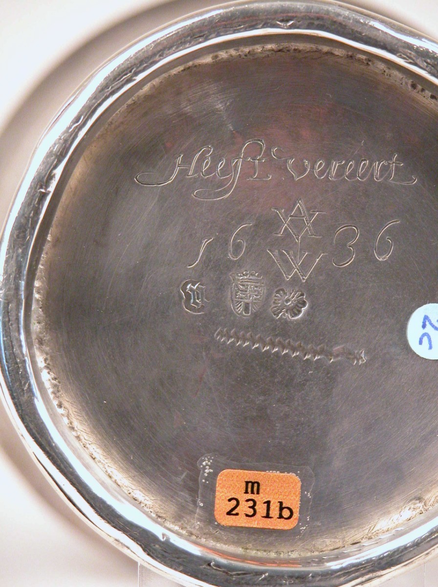 Avondmaalsbeker met onderaan bovenrand "De drincbeker daer mede wy dancseggen is de gemeynscap des bloets Christi" waaronder drie ovale medaillons met de geboorte, het laatste avondmaal en de verrijzenis van Christus. Tussen elk een toef vruchten waarop een vogel. Op de onderkant monogram "AYW" met jaartal 1636.