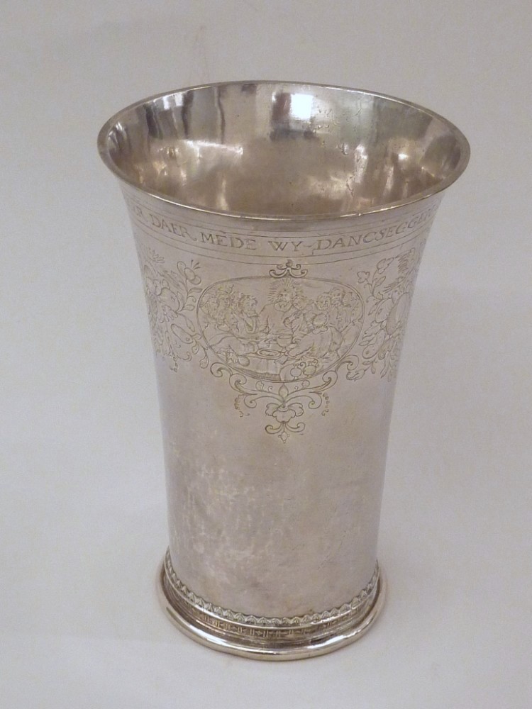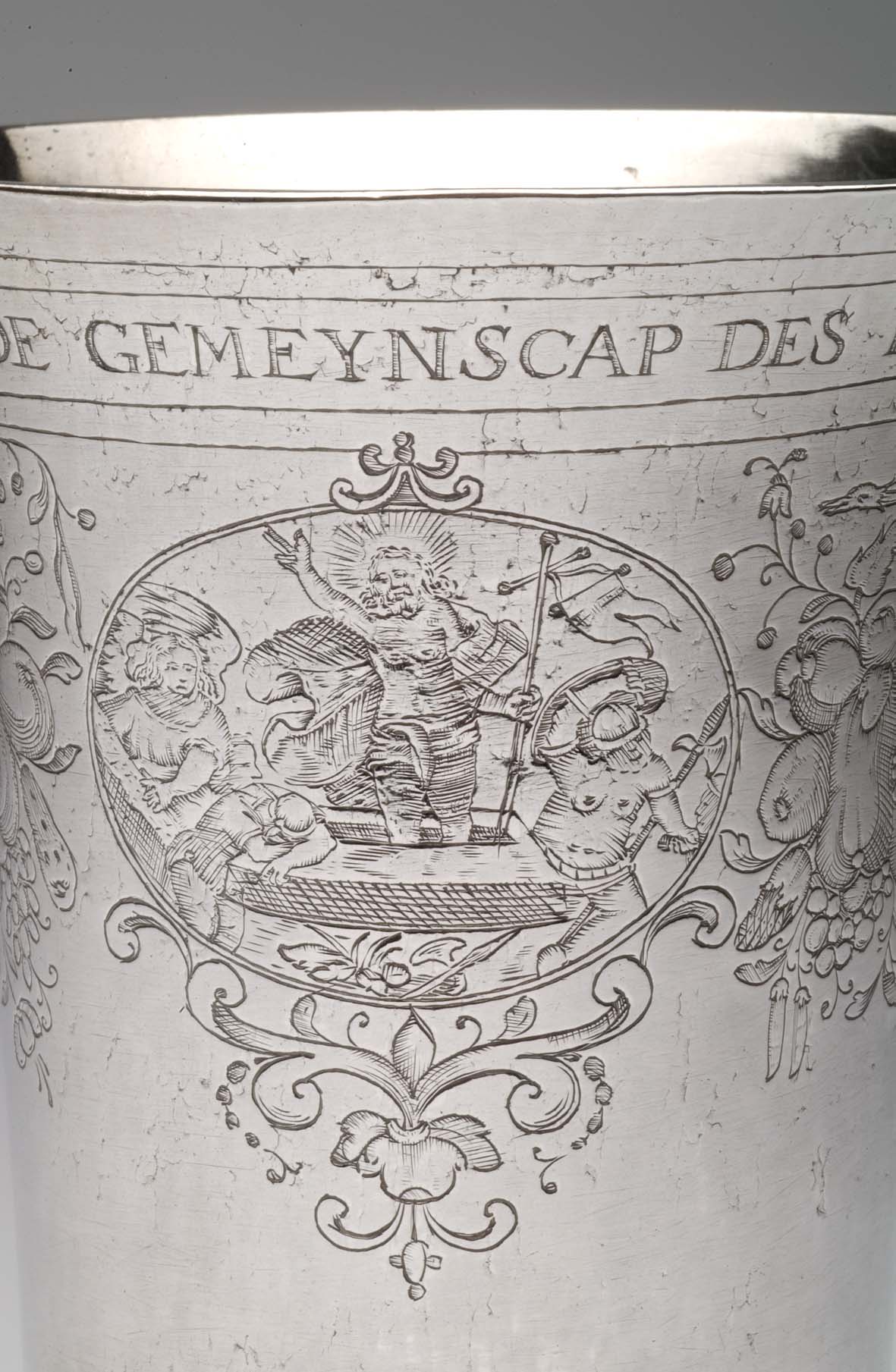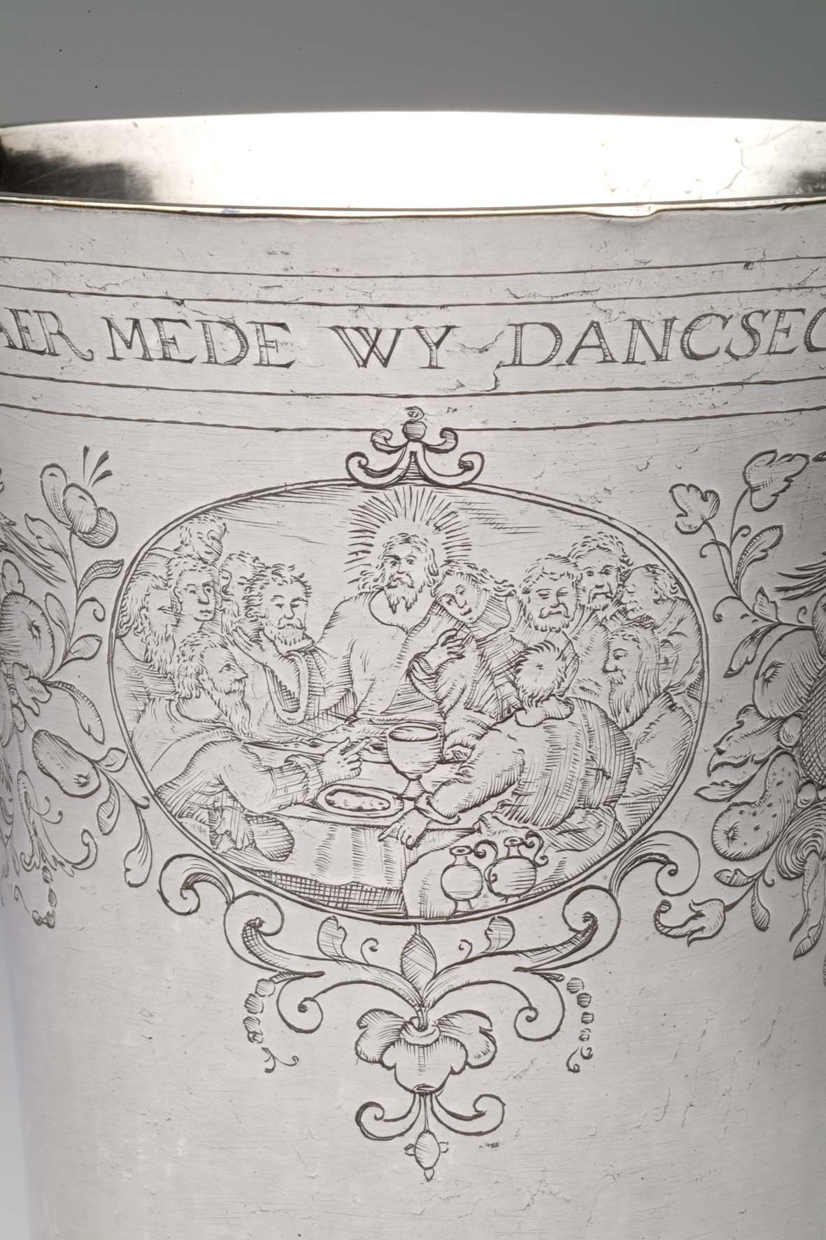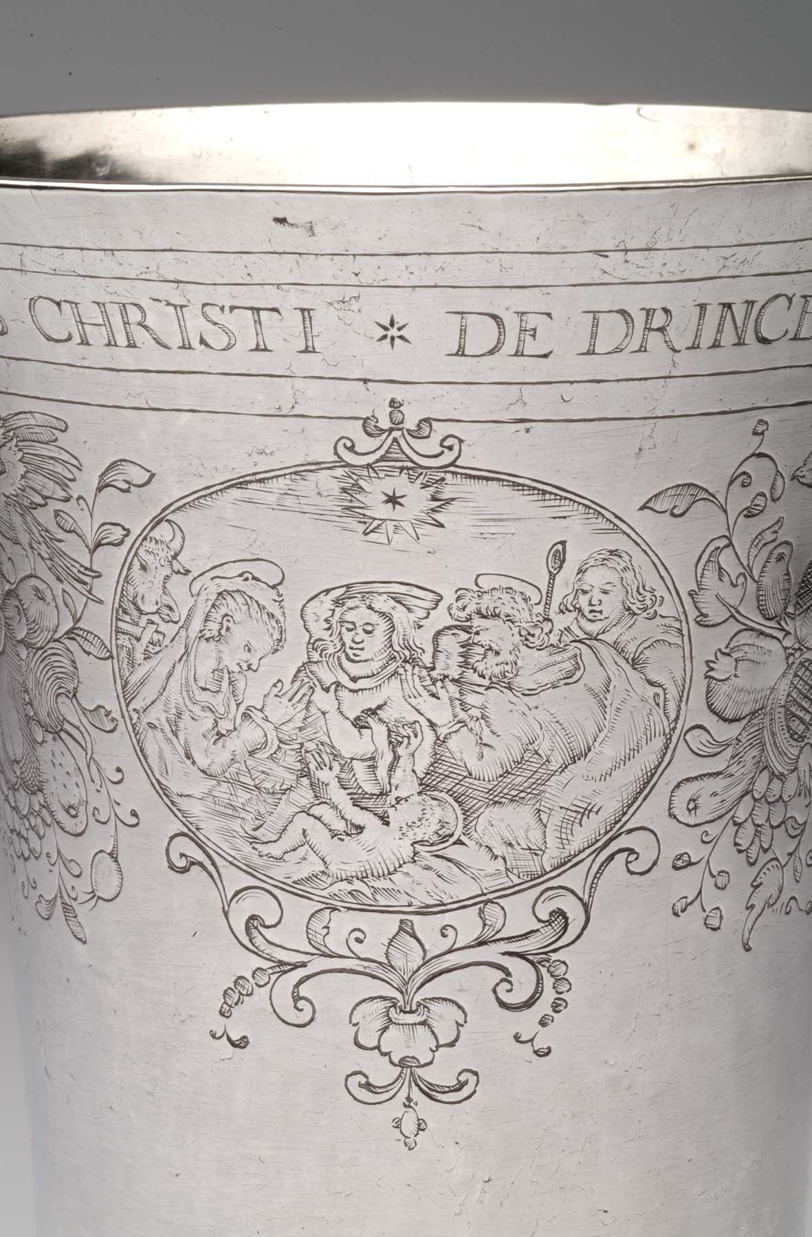 Avondmaalsbeker met onderaan bovenrand "De drincbeker ... des bloets Christi" waaronder drie ovale medaillons met de geboorte, het laatste avondmaal en de verrijzenis van Christus