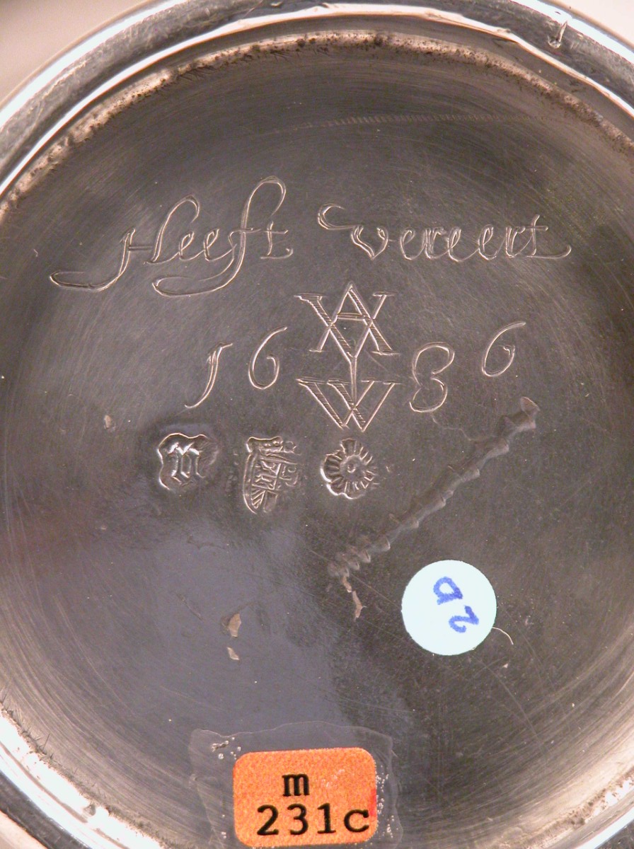 Avondmaalsbeker met onderaan bovenrand "De drincbeker daer mede wy dancseggen is de gemeynscap des bloets Christi" waaronder drie ovale medaillons met de geboorte, het laatste avondmaal en de verrijzenis van Christus. Tussen elk een toef vruchten waarop een vogel. Op de onderkant monogram "AYW" met jaartal 1636.