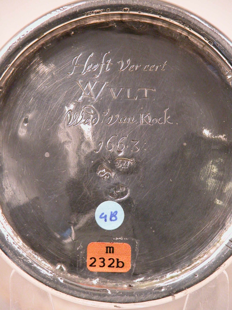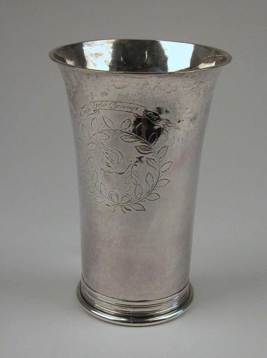 Avondmaalsbeker met gegraveerde duif met tak in de snavel waarboven lint met "Christi liefde bedwingt ons", met enige profilering aan de onderrand. Op onderzijde "Heeft vereert W.V.L.T. Wed. van Kock 1663"
