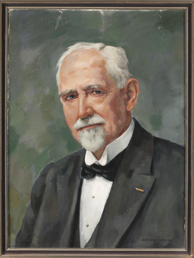 Rechtsonder gesigneerd: Roeland Koning. Op achterzijde doek: 'Geschenk van oud-leden op / geschilderd naar foto'.