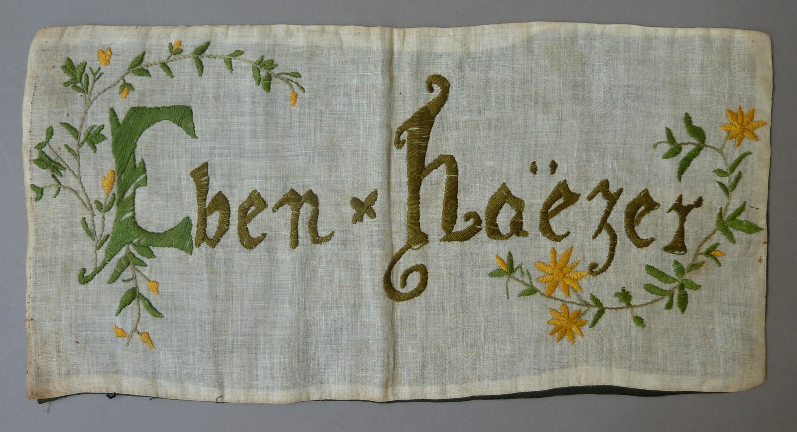 Borduurlap met bloemversiering en "Eben haezer"