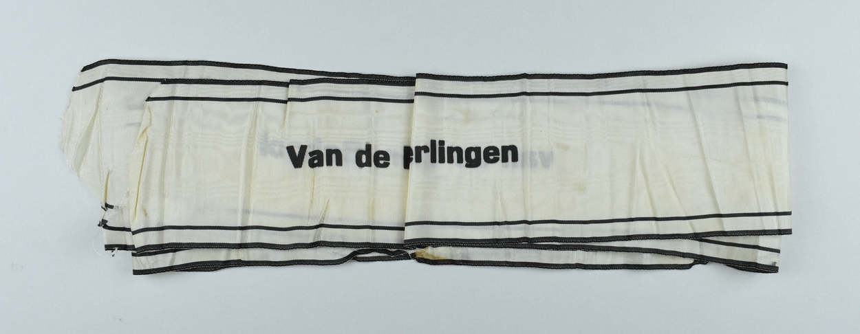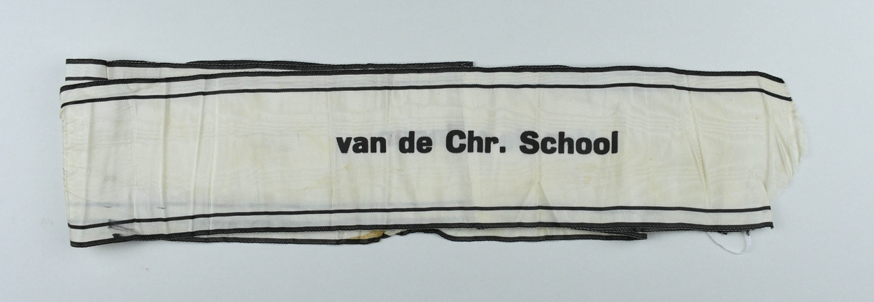 Witte strik van rouwkrans met "Van de leerlingen van de Chr. school"