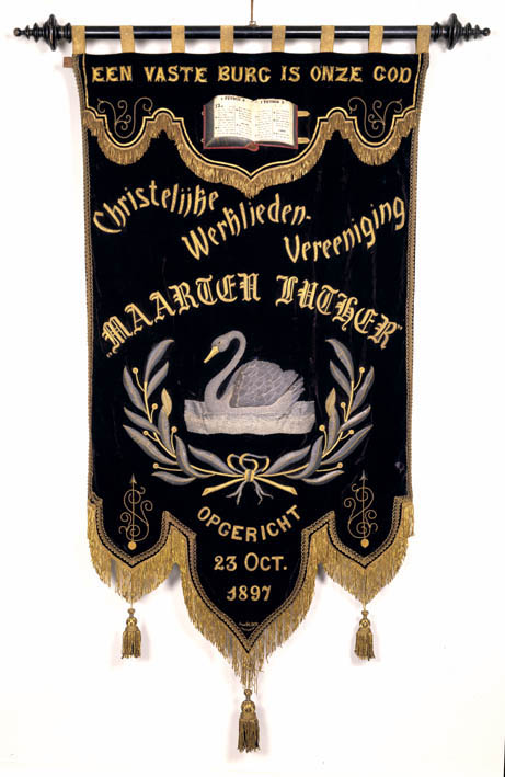 Vaandel van de Christelijke Werklieden Vereniging Maarten Luther met "Een vaste burg is onze God.", "Christelijke Werklieden Vereeniging Maarten Luther, opgericht 23 oct. 1897", met geborduurde opengeslagen bijbel '1 Petrus 2 en 1 Petrus 3' en zwaan.