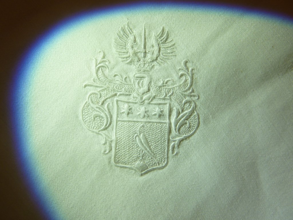 Tafellaken met ingeweven bladmotieven en putti, met geborduurd wapen, gebruikt als avondmaalskleed