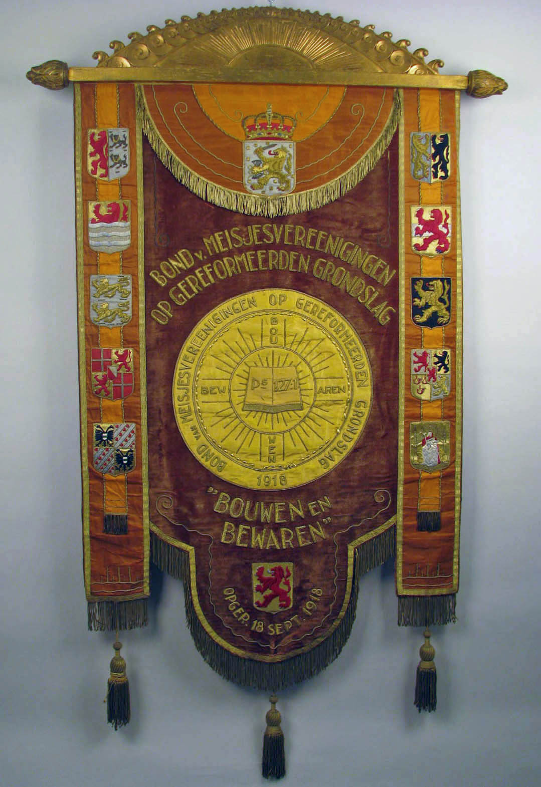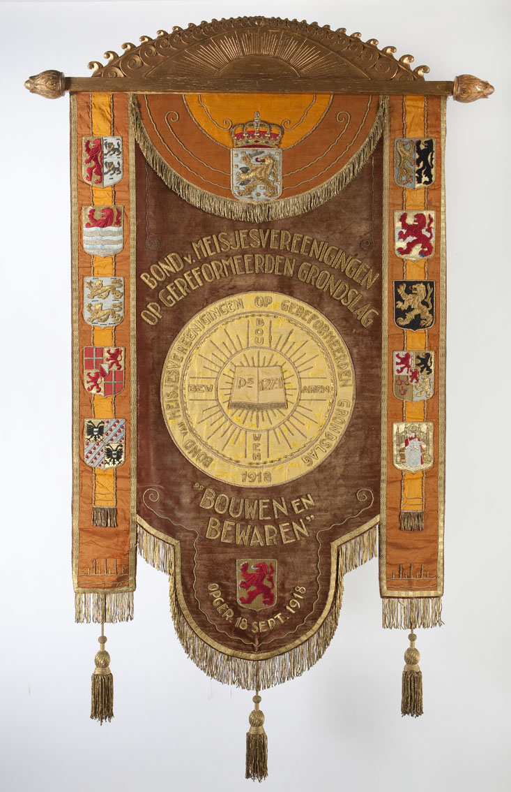 Bruin vaandel van de Bond van Meisjesvereenigingen op Gereformeerden Grondslag Bouwen en Bewaren (opgericht in 1918), met rondom wapen van Nederland en provinciewapens