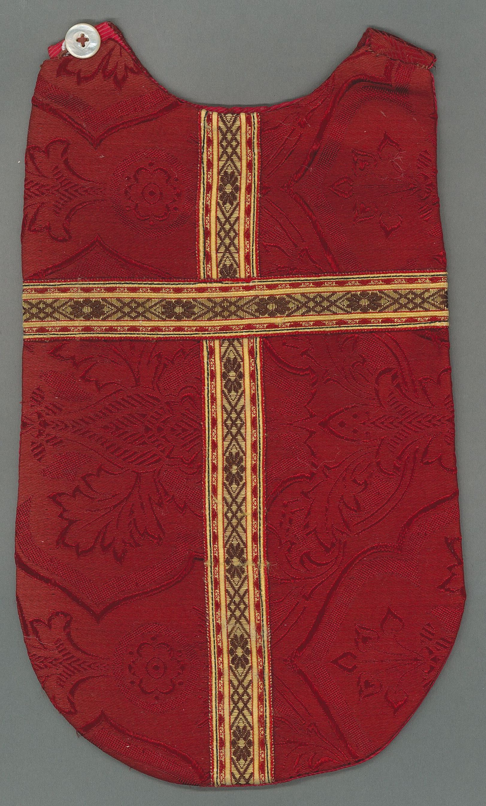 Modelaltaar met toebehoren: rood kazuifel met ingeweven granaatappels en geel-bruin kruisje
