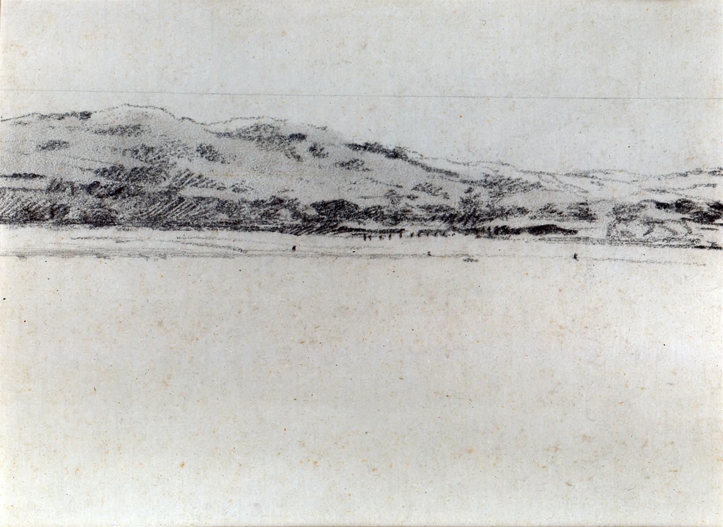 Landschapstekening: een heuvelrand in de verte met een lege voorgrond, een duinlandschap.