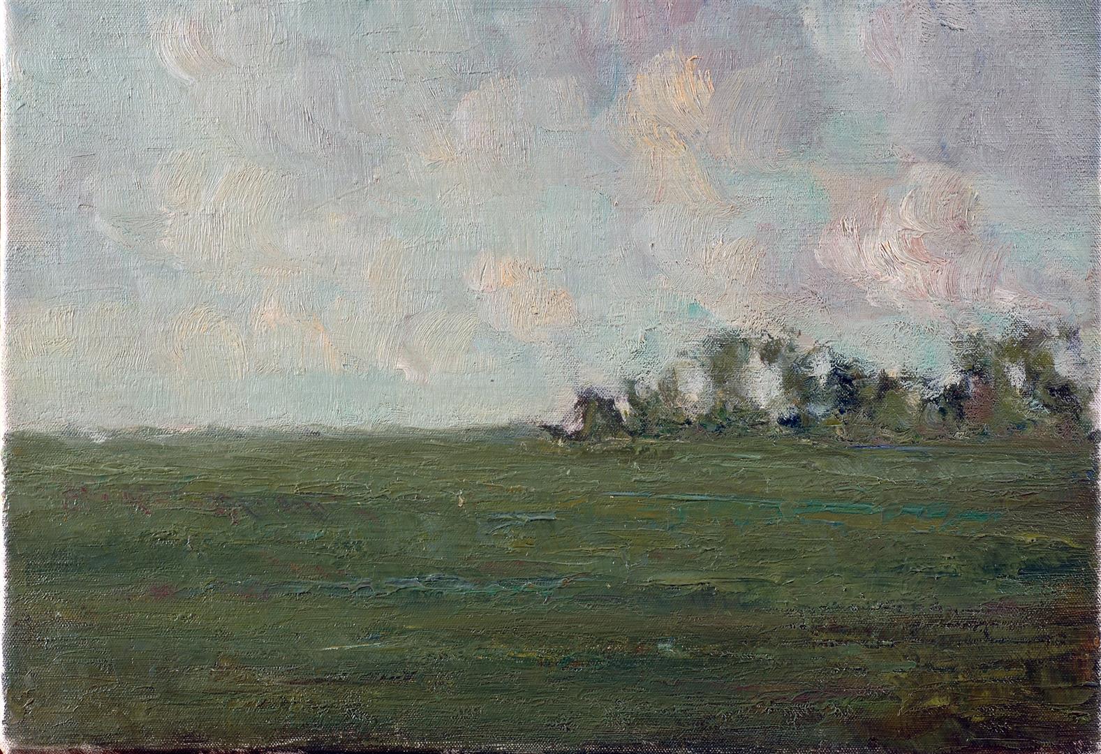 Leeg weidelandschap met rechts een boomgroep aan de horizon, wat kleur in de lucht.
