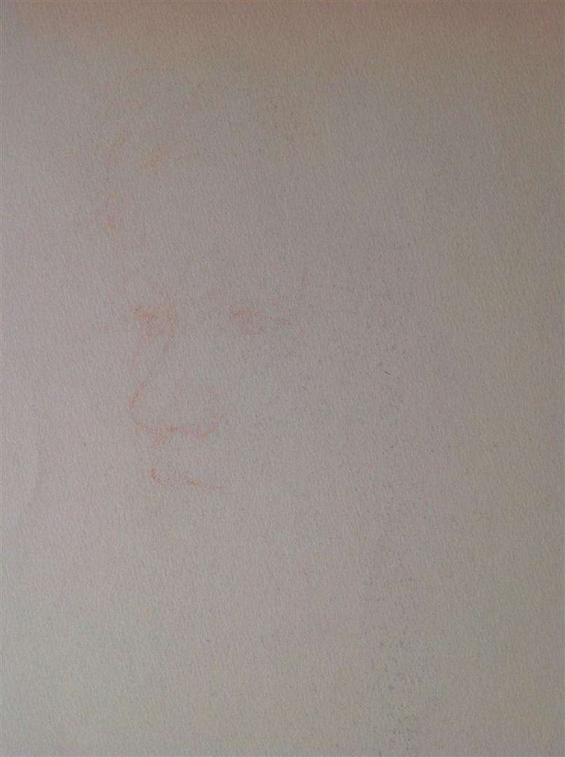 In rood krijt heel licht de aanzet tot een portret van een kind.