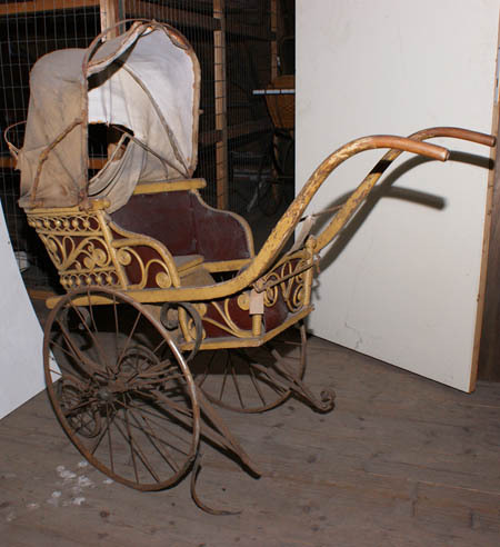 Kinderwagen op 2 hoge grote voorwielen en 2 kleine achterwielen, open rietpatroon en neerklapbare kap.