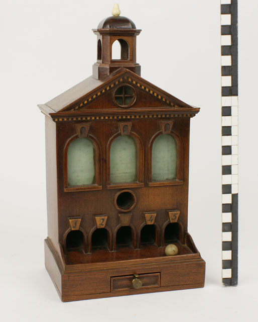 Spel in de vorm van een houten gebouw met open torentje waar een knikker in gegooid kan worden die dan in 1 van de 5 genummerde vakjes beneden terecht komt. In het rechthoekige voetstuk een laadje met een veer en een dekseltje. Op het torentje een benen knop. De diverse openingen zijn van boven rond, ...