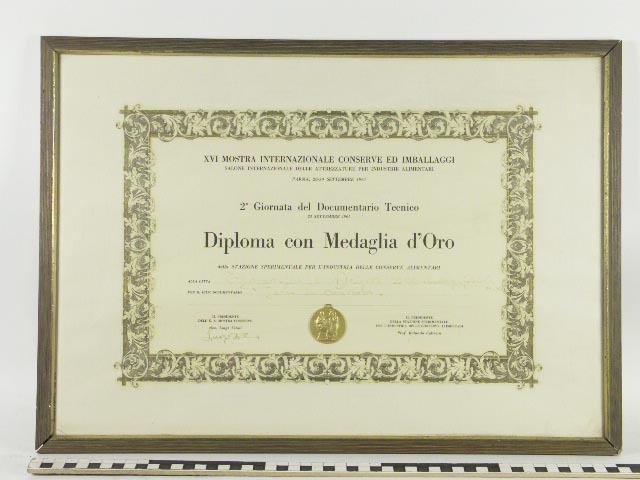 Diploma met gouden medaille voor Thomassen & Drijver in lijst. Prijs voor de documentaire 'Leven in Overvloed' op de internationale tentoonstelling in Parma, Italië 20-30 september 1961