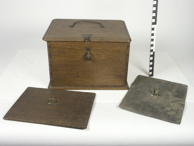 Kist van hout met klapdeksel voor thee of tabak, van binnen bekleed met lood. 2 binnen deksels, een van hout en een van lood