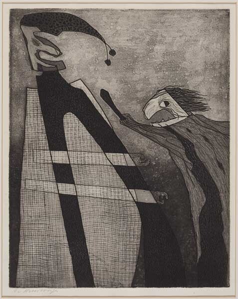 Compositie met twee fantasiefiguren in verschillende zwarttonen. Het betreft een ets uit een serie getiteld: leven en willekeur in Amsterdam, 33 etsen geïnspireerd op middeleeuwse willekeuren, rechterlijke uitspraken en andere historische documenten, vervaardigd door Harry van Kruiningen, in 1970 uitgegeven door het Amsterdams Historisch Museum. Deze prent stelt Jan Klaassen en Katrijn voor. Prent 8 ...