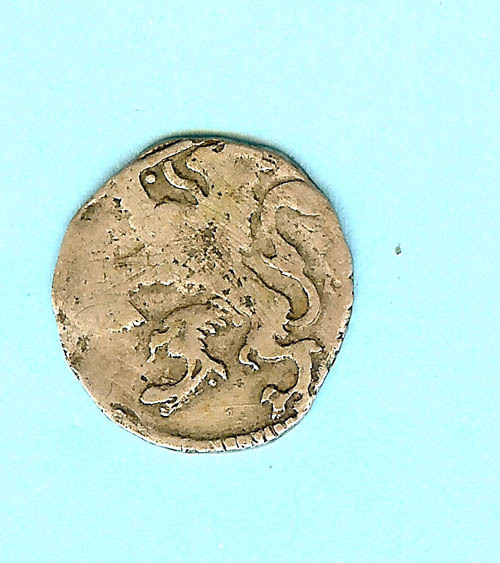 Dubbele stuiver van Deventer van 1683, voorzijde een staande leeuw tussen 2 S, keerzijde DAVEN TRIA 1683