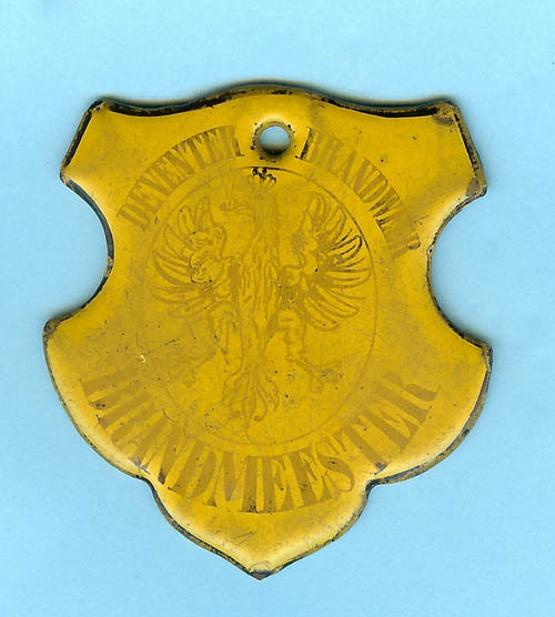Brandspuitpenning in de vorm van een schildje met de tekst Deventer Brandweer Brandmeester