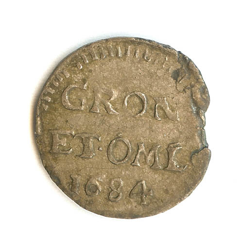 Stuiver met op de voorzijde gekroond wapenschild en 1 S , keerzijde GRON ET OML met jaartal