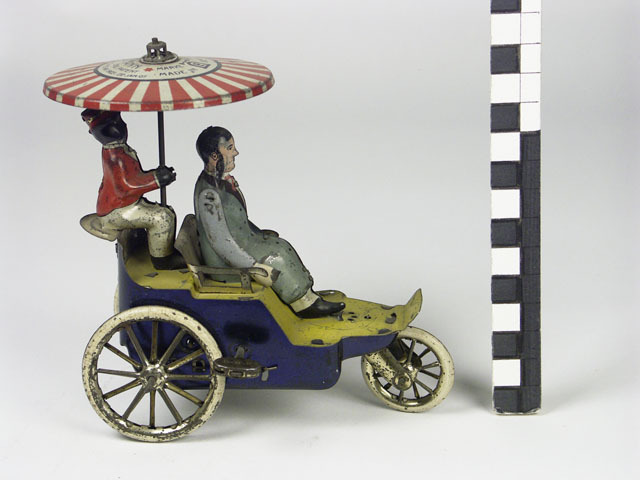 bedrukt blik; 3-wielige auto (1 voor, 2 achter); van buiten blauw en van binnen geel; op achterbank zit een in rood en wit geklede passagier met opgestoken rood - witte parasol; op voorste bank de bestuurder in grijze jas met bruine revers; opwindbaar: links met vaste sleutel; schroefveer; verlengde steel parasol tandrad, waardoor de auto ...