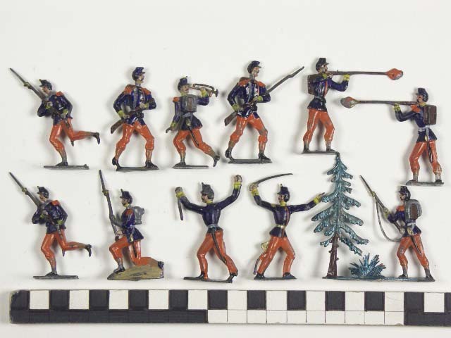 set van 11 geverfde militairen in tinlegering; uniform: blauwe sjako; blauwe jas met gele col en manchetten, rode bies en koppelriemen in verschillende kleuren; rode broek; a. officier met gebroken sabel; 5,5 cm hoog; b. hoornblazer; 4,8 cm hoog; c. soldaat in looppas met geweer met bajonet in draaghouding; 5,8 cm hoog; d. dito; 5,2 ...