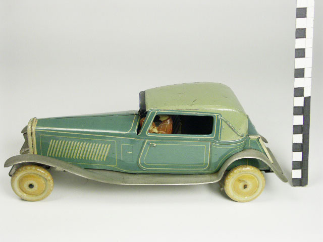 bedrukt blik; auto in lichtblauw-groen en wit; motorkap en carrosserie en kofferruimte lichtblauw; dak in groen en zwarte voorklep; spatborden (doorlopend), treeplanken en onderstel in blank metaal; motorkap-carrosserie-radiator wit gemarkeerd + groen; op voor en achterkant nummerbord HH 73577 in blauw op witte ondergrond; vooras verstelbaar in alle richtingen; spiraalveer met losse sleutel op achteras; ...