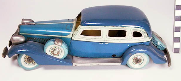 bedrukt blik; auto in blauw-groen en wit; motorkap, carrosserie, spatborden (doorlopend) in blauw; radiator-bumpers en treeplanken en 2 koplampen in blank metaal; de raamkozijen in groen en wit; de voorwielen verstelbaar in alle richtingen; de aandrijving is stuk; 4 wielen en banden van metaal en reservewiel in donker- en lichtblauw en wit (2 stuks)