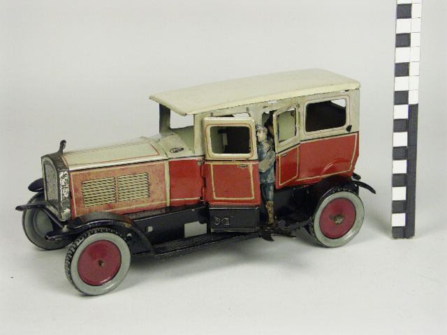 bedrukt blik; auto in beige-rood-zwart; motorkap in beige en rood; carrosserie: beige dak, raamkozijnen beige, zijwanden rood; onderstel-spatborden (doorlopend) en treeplanken zwart; radiator en omlijsting in licht koperkleur; op de achterkant bedrukt, een wiel met merkteken; bestuurder in blauw; op treeplank kan via mechanisme de cabinedeur geopend worden; passagier in blauw; 2 deurtjes, rechts en ...