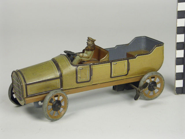 bedrukt blik; auto in oker met donkerbruine en gele markering; bestuurder in geelbruine jas en pet; rechtervooras verstelbaar in 2 standen; spiraalveer met vaste sleutel op achteras; onderkant in lichtbruin; 4 metalen wielen in lichtbruin met grijs geverfde banden; aan de achterkant merkteken