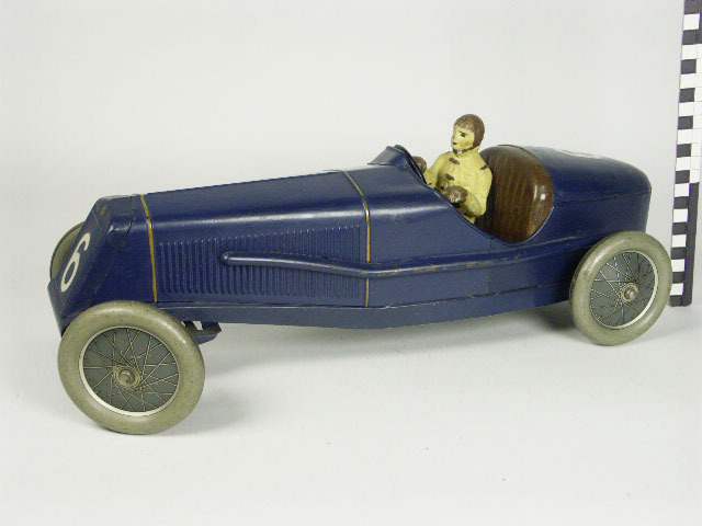 geverfd blik; auto in blauw geverfd met 2 okeren biezen op motorkap; bestuurder van gips in geel-bruin uniform; de zitplaats in bruin met zwart stuur; boven de achterkant cijfer 6 in wit op; idem op radiotor; op de omlijsting van de radiator het merkteken; voorwielen verstelbaar in alle richingen; spiraalveer met losse sleutel op achteras; ...
