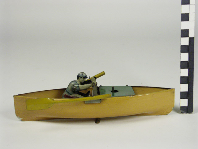 roeiboot in oker en groen bedrukt blik; lang ovaal spits toelopende boot; roeier in blauw en grijs en zwarte markering; groene kap; spiraalveer met losse sleutel; door mechanisme worden de roeispanen in roeiende beweging gebracht en de roeier ook in roeiende beweging