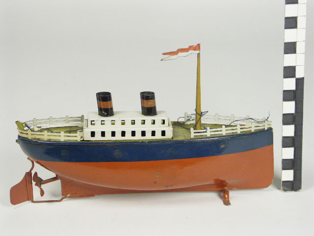 schip in rood-blauw-geel-wit-zwart bedrukt materiaal; spits toelopende voorkant; achterkant is rond; buitenkant rood en blauw; op voor- en achterscip een crème railing; het dek is in houtmotief met anker, touwen, dreggen en luiken in zwart bedrukt; midschips een witte passagiers- ruimte en 2 schoorsteenpijpen in zwart met rode band; mast oranje met rood-witte vlag; op ...
