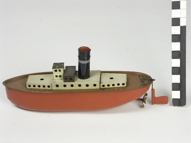 schip in rood bedrukt materiaal; bovendek met enkele opstanden met schoorsteenpijp in resp. geel-bruin-zwart; schroef en roer aan achter-(onder)kant; op roer: MADE IN GERMANY ; op schoorsteen: MADE IN U.S.ZONE GERMANY ; nr.310