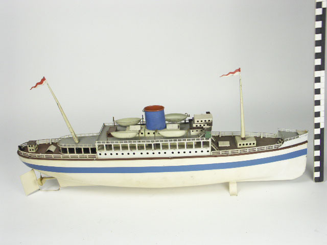 schip in wit-blauw-bruin-grijs bedrukt blik; de zijkanten zijn wit met een blauwe band; het dek is bruin bovendek is grijs; passagiershutten met witte ramen; railing in wit; 4 trappen naar de dekken in wit; op het bovenste dek een schoorsteenpijp (blauw, van binnen rood), 3 verhoogde platforms, 4 reddingssloepen in grijs; 2 masten in crème ...