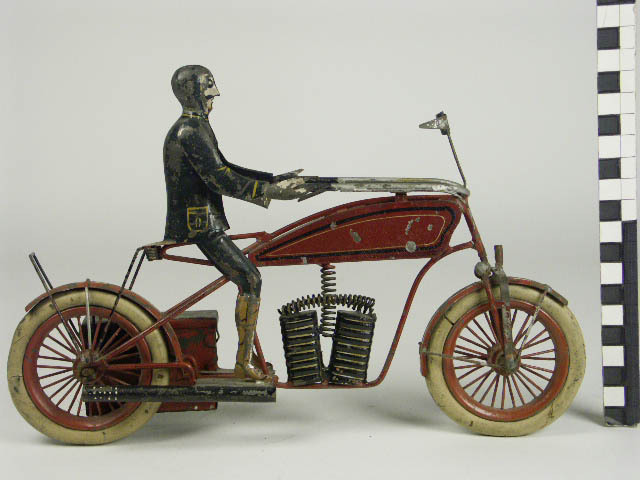geverfd blik; kleuren motor: rood, zwart, geel en wit gebiesd; cilinders zwart met goud; uitlaatpijp zwart met witte stippen; banden wit rubber; uurwerkkastje: voorkant groen, achterkant rood; berijder in donkergroen pak met wat oranje, en oranje laarzen; type: ? Indian