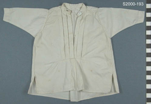 Wit katoenen mannenhemd met lange mouw. Rechte boord als halsafwerking. Middenvoor split met geplooide pas. Middenachter stolplooi. Schouder- en achterpas. Splitjes in zijnaden. Sluiting: 1x knoop + knoopsgat.