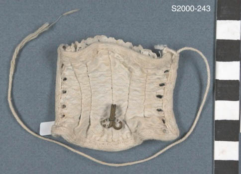 Helft van een klein corset van witte katoen met ingeweven golfjes. Vijf