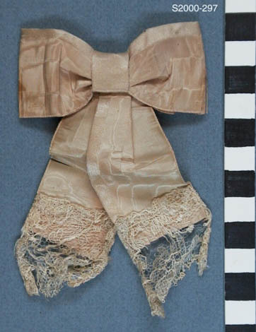 Strik van beige zijden lint, afgezet met kant. n.a.w. deel van pronkhoed Sallandse streekdracht