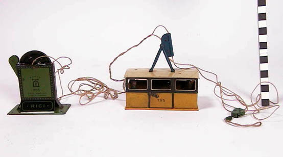 Kabelbaan bestaande uit bakje met twee personen wat aan een touw hangt, aan een kant van het touw een katrol en aan de andere kant een hendel waarmee je het bakje kan verplaatsen