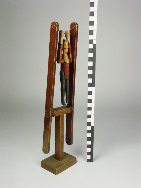 Acrobaat gemonteerd op draad tussen een houten knijper, bij manipulatie van de knijper draait de acrobaat rond