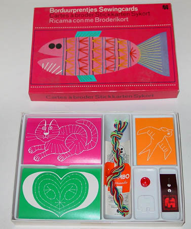 gekleurde kaarten met in witte lijnen borduurfiguren en een streng met verschillend gekleurde draden, 1 kaartje met borduurnaald