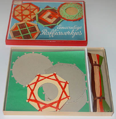 geometrische vormen van karton met uitsteeksels rondom, die omwikkeld kunnen worden met de bijgeleverde vier kleuren raffia