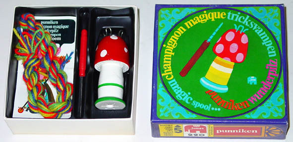punnikklosje in de vorm van een paddenstoel rood met witte stippen , met een streng wol in verschillende kleuren en een naald met handvat om de steken over de pinnetjes te wippen, met gebruiksaanwijzing