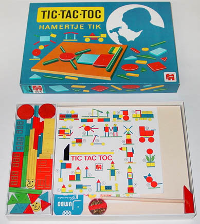 Diverse houten plaatjes, pinnetjes en schijfjes, die met het houten hamertje op de houten onderplaat getimmerd kunnen worden, met voorbeelden hoe je er bijvoorbeeld een molen, trein of poppetjes mee kunt maken