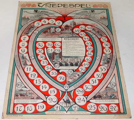 Bordspel naar aanleiding van de tweede Vredesconferentie in Den Haag en het begin van de bouw van het Vredespaleis. Met afbeeldingen van bazuinblazende vredesfiguren, de reis van diverse staatshoofden, het galadiner in Den Haag en een fantasievoorstelling van het te bouwen Vredespaleis. Techniek: kleurenlitho.