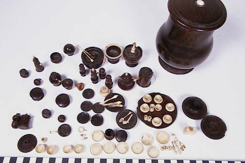 Houten pot met miniatuur serviesgoed