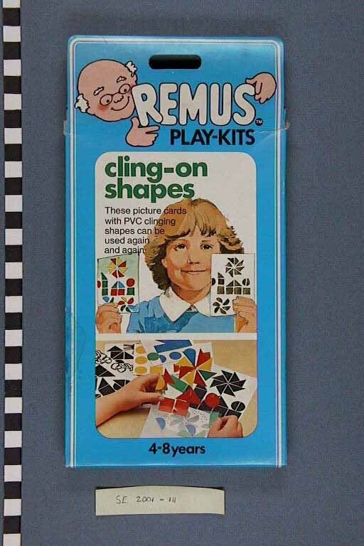 Remus play-kits doos: Cling-on shapes. Inhoud: 3 kaarten met afbeelding, 1 sheet doorzichtig plastic, 1 vel met gekleurde p.v.c. vormen. Prodnr. is 103. Uitleg en omschrijving inhoud op achterkant. Voor 4 tot 8-jarigen.