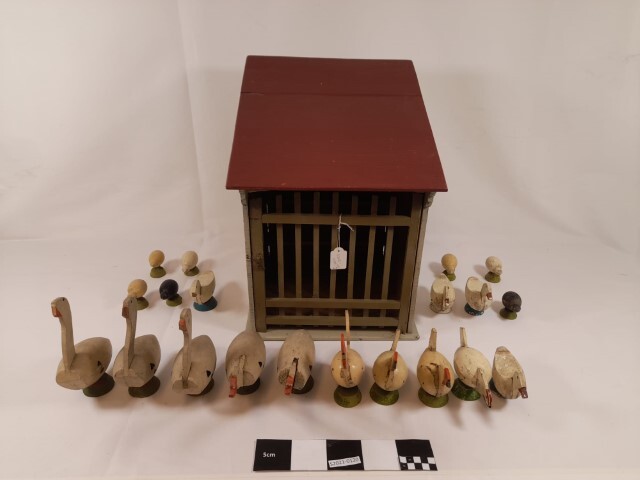 Kippenhok met 5 ganzen, 1 haan, 3 kippen, 4 eenden, 2 zwarte kuikens, 5 witte kuikens. Genummerd 0120 A t/m U. Oorspronkelijk nummer: 3806.