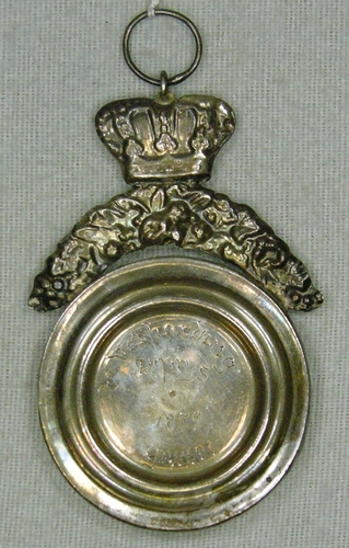 Prijsmedaille handboogschutterij, materiaal: zilver, circelvorm met inschrift: de volharding 2de prijs 1879 Gestel, festoenband bovenop met kroontje en draagringetje, 8,5 x 4,4 x 0,6 cm Prijsmedaille handboogschutterij, materiaal: zilver, circelvorm met inschrift: De Volharding 2de prijs 1879 Gestel, festoenband bovenop met kroontje en draagringetje, 8,5 x 4,4 x 0,6 cm