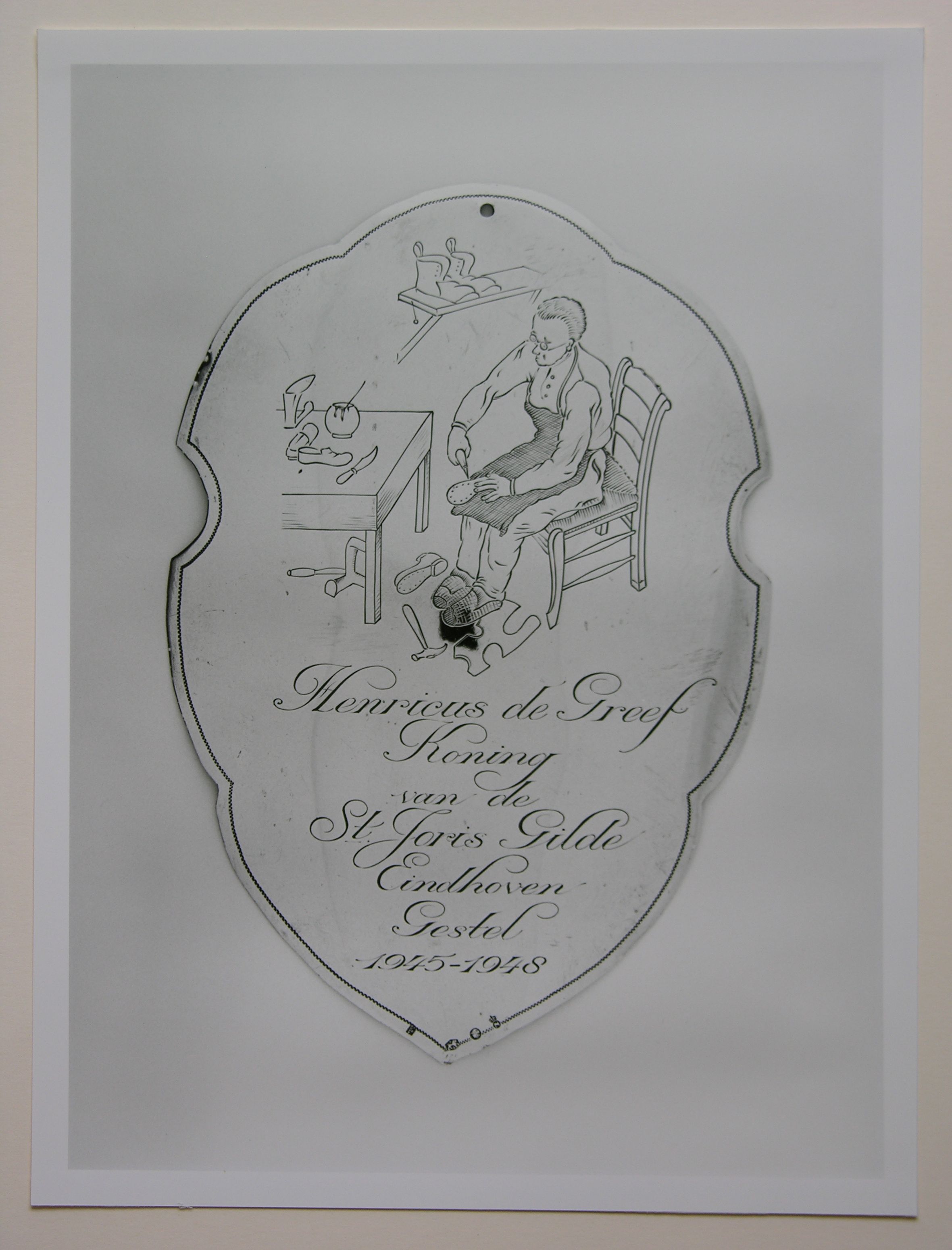 Koningsschild Sint-Jorisgilde Gestel en Blaarthem, 1945-1948 meesterteken: J.M.A.van Hout (fa.J.van Hout - Ververgaard) Eindhoven. tekst: Henricus de Greef/Koning/van de/St.Joris Gilde/Eindhoven/Gestel/1945-1948. Voorstelling: bij een tafel met schoenmakersgereedschappen is op een stoel een schoenmaker aan het werk. Op een plank een paar schoenen. Zie voorts tentoonstellingscatalogus, cat.nr 4 blz.17. in passe-partout