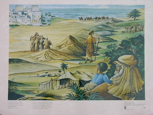 Schoolplaat met titel: 'Jozef en de broers' , kleurenlithografie/papier/karton, tekening/ontwerp: Ben Horsthuis, uitgave: St. Gregoriushuis, Utrecht, druk: Missiehuis Steyl, serie Bellarminus Bijbelplaten nr. 13, gesigneerd in voorstelling l.o.: Ben Horsthuis, onder voorstelling het opschrift: Ik ben Jozef, uw broer (Genesis 45: 4), afmetingen 630 mm x 750 mm app.eccl. Ultr. 19-1-1951